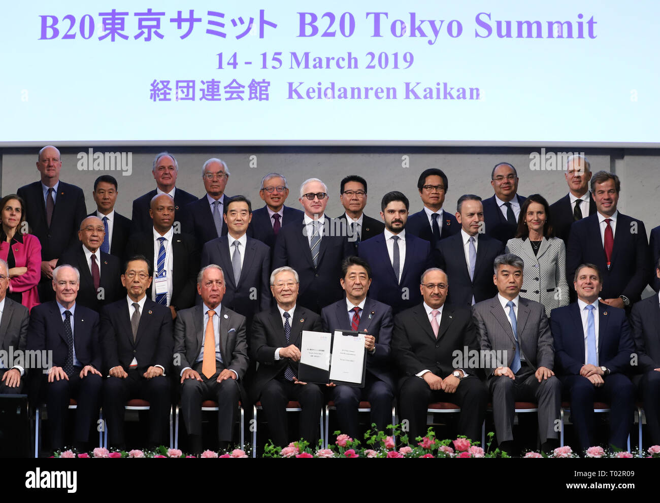 Tokyo Japan 15th Mar 2019 Japanese Prime Minister Shinzo Abe C R Receives The B20 Tokyo Summit Joint Recommendations To The G20 Chair From Japan S Largest Business Group Keidanren Chairman Hiroaki Nakanishi